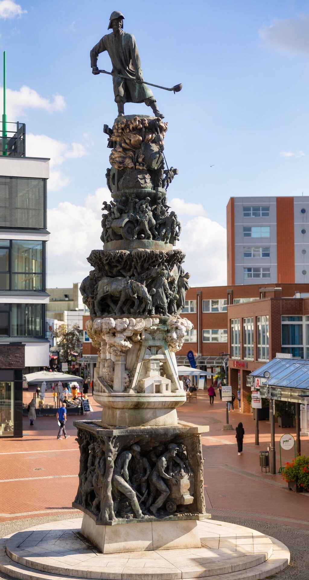 Fast 14 Meter hoch und mehr als 730 Zentner schwer, hat das Monument in der lebhaft frequentierten City seinen Platz gefunden und gibt einer immer noch jungen Stadt Identität. Auf seiner Spitze erhebt sich der Probennehmer aus dem Hüttenwerk, der den Lebens- und Aufbauwillen der Menschen symbolisiert. Das bildhauerische Kunstwerk ist für viele Betrachterinnen und Betrachter eine Begegnung mit der eigenen Lebensgeschichte.
