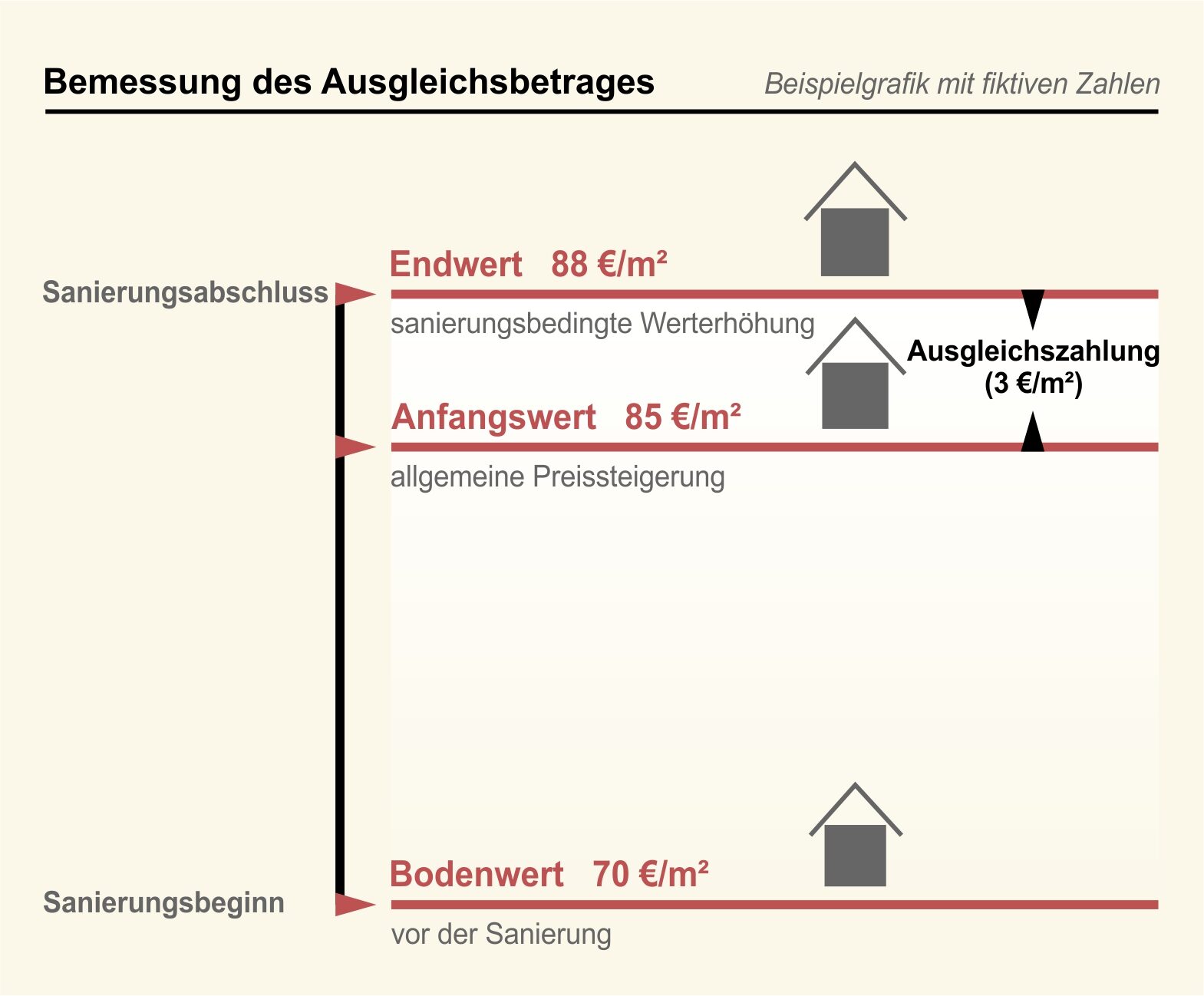 Mit diesem Ausgleichsbetrag ist die Steigerung des Bodenwertes auszugleichen, die infolge der Sanierungsmaßnahmen der zurückliegenden Jahre bereits eingetreten ist und durch Maßnahmen in künftigen Jahren bis zum (Teil-)Abschluss des Sanierungsverfahrens weiterhin eintreten wird.