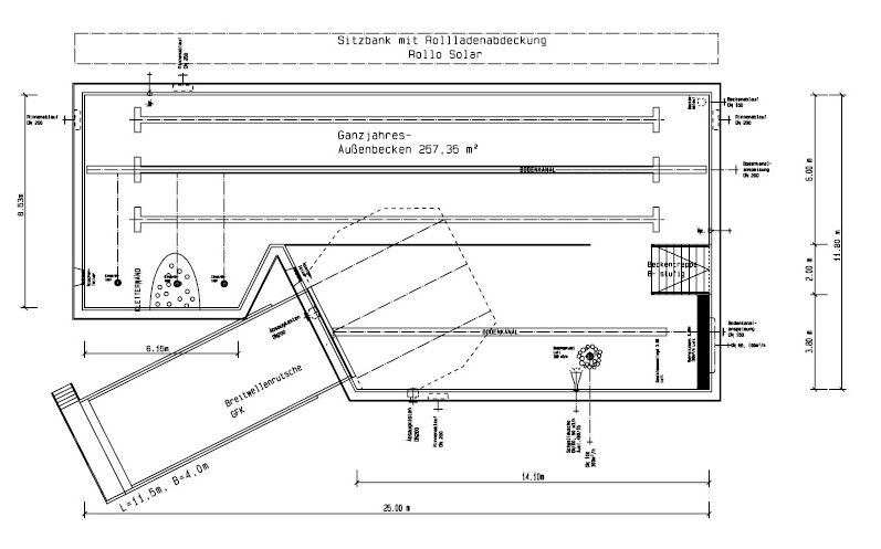 Das neue Projekt eines 25m-Ganzjahresaußenbeckens mit Rutschenanlage soll diese fehlende Wasserfläche kompensieren und das Schwimmsportangebot für öffentliche Gäste, aber auch für Schulen und Vereine erhalten.