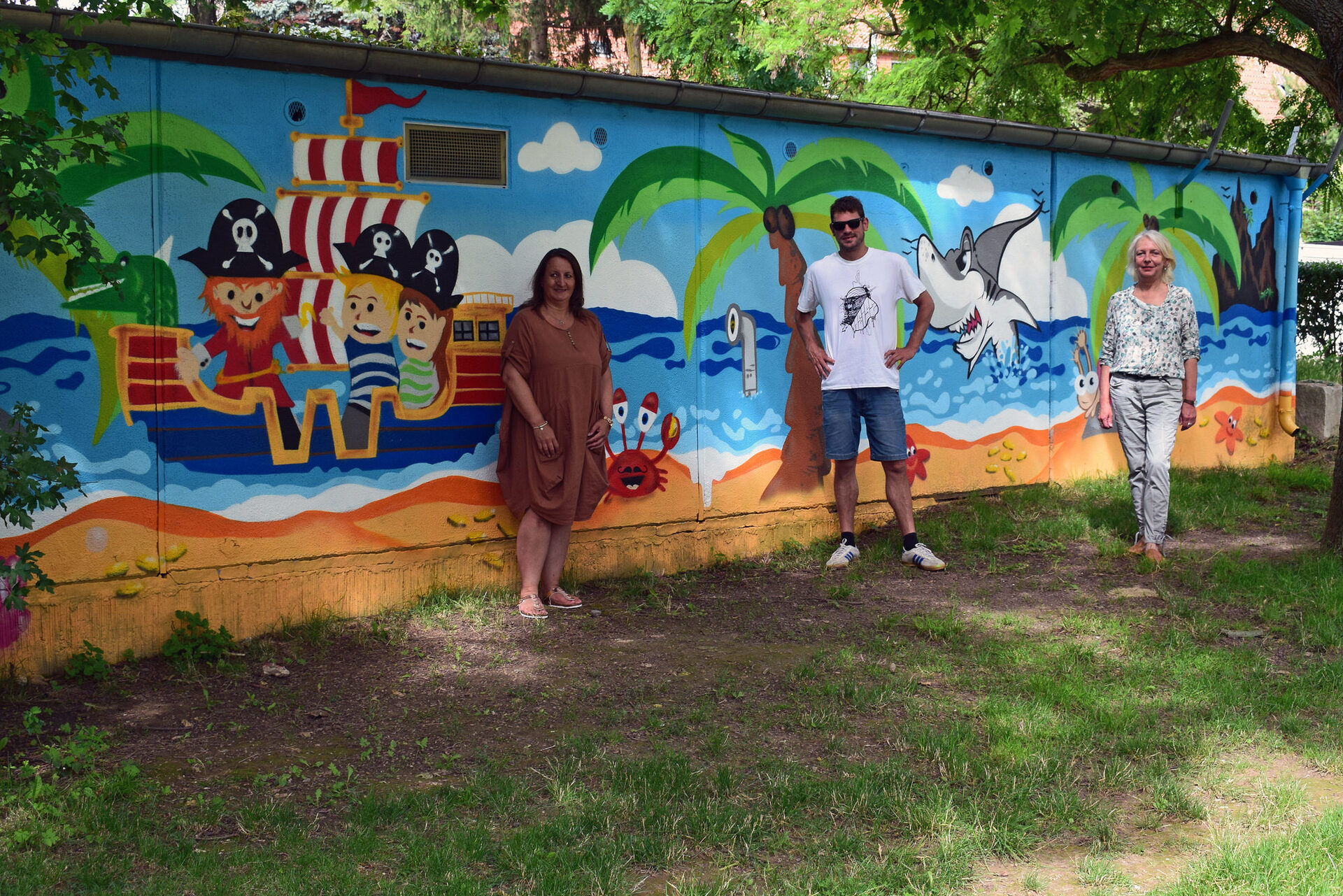 Doch die Jugendlichen sprayten immer besser. Das gefiel den Besucherinnen und Besuchern des Spielplatzes und den Anwohnerinnen und Anwohnern so gut, dass sie mit den Graffiti-Künstlern ins Gespräch kamen und ebenfalls ihre Wünsche äußerten. Die Kinder freuten sich über die passende malerische Urlaubsatmosphäre zum Landrattenspielplatz. Begeistert sind sie vor allem darüber, dass es Goldstücke zu finden gibt. Die Schatzsuche kann fortgesetzt werden……